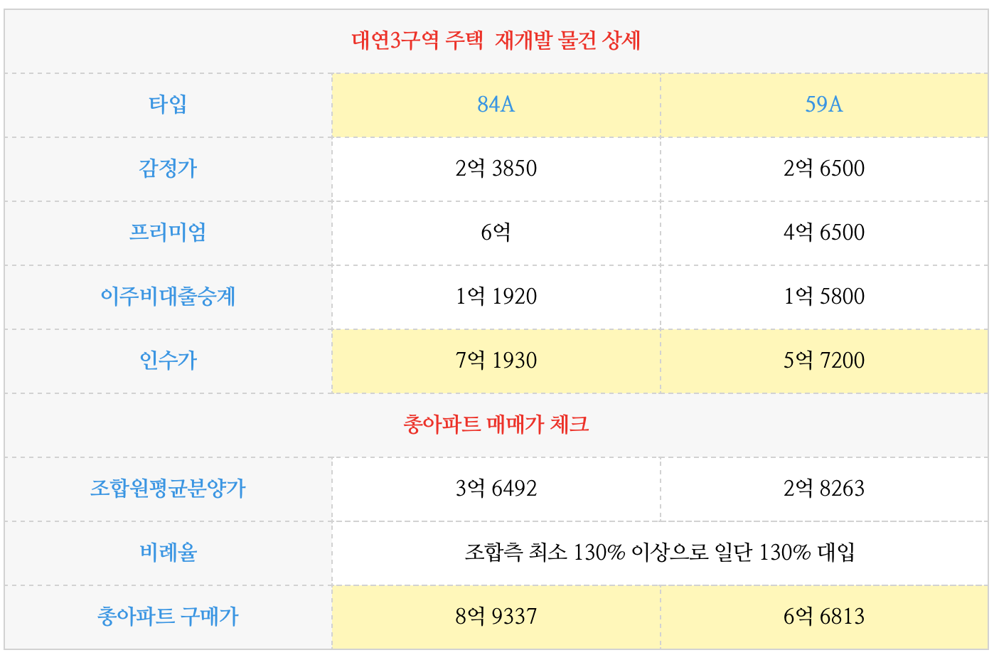 대연동 재개발 대장 대연3구역 재개발 각 타입별 물건 정보 부터 드리고 구역 설명도 드리겠습니다.