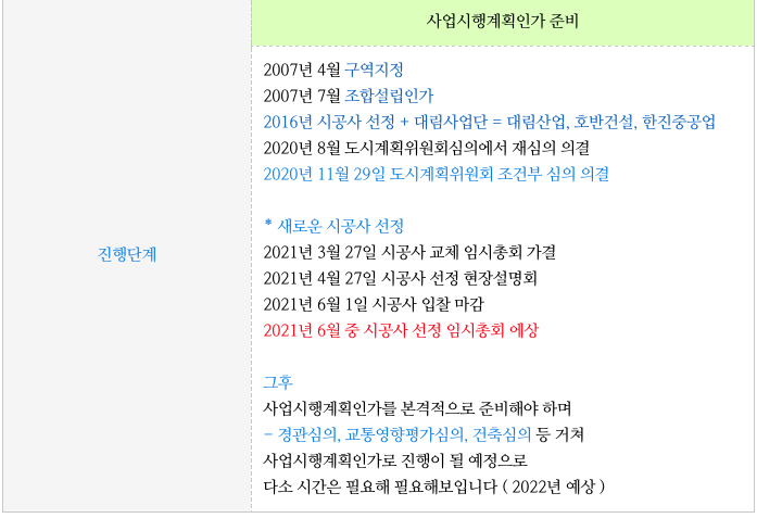 이에 따라, 현재 새로운 시공사 선정 작업이 진행중에 있습니다.