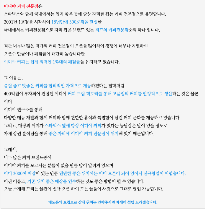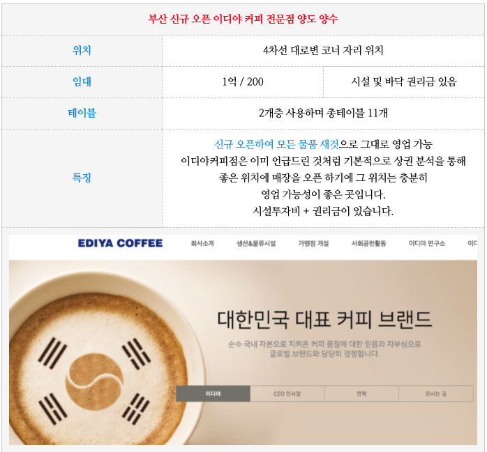 커피전문점 이디야 커피전문점의 양도 양수 물건을 소개해 드립니다.