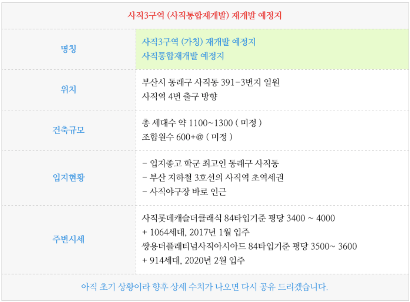 부산의 재개발 예정지중에 A급 예정지중에 하나가 바로 사직3구역 재개발 예정지 입니다.