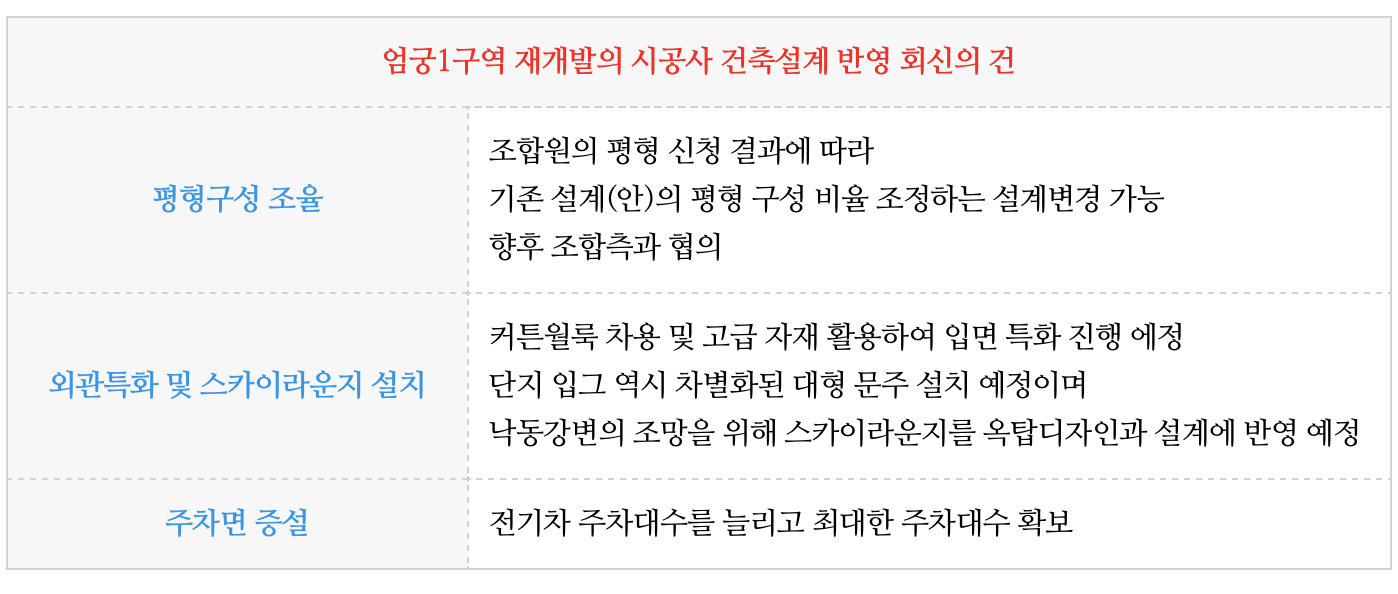 - 조합측에서 문의한 아래 부분들에 대해 시공사측에서 긍정적인 답변이 와서 기대가 되고 있습니다.