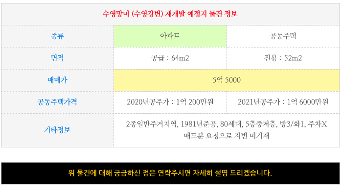 (가칭) 수영망미 (수영강변) 재개발 예정지 의 물건 정보를 드리겠습니다.