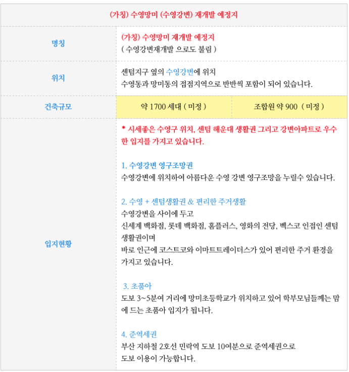 수영망미 재개발 예정지의 진행 상황과 주변시세등 정보는 아래 페이지를 참고 하시면 됩니다.