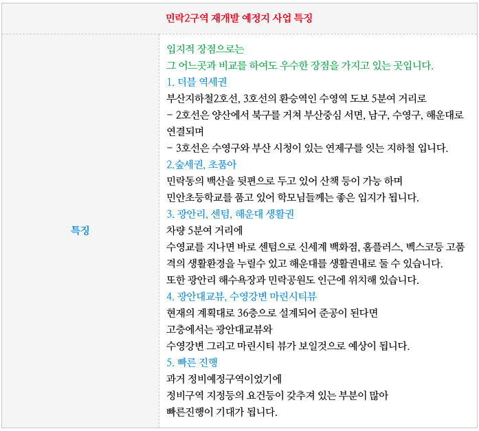 민락2구역 재개발 예정지의 특징을 간략히 정리하였습니다.