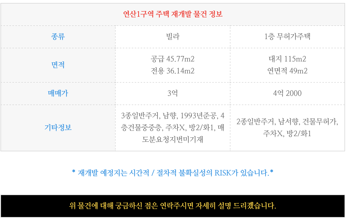 연산1구역 재개발 예정지에 대해 궁금하신 점은 연락주시면 자세히 설명 드리겠습니다.