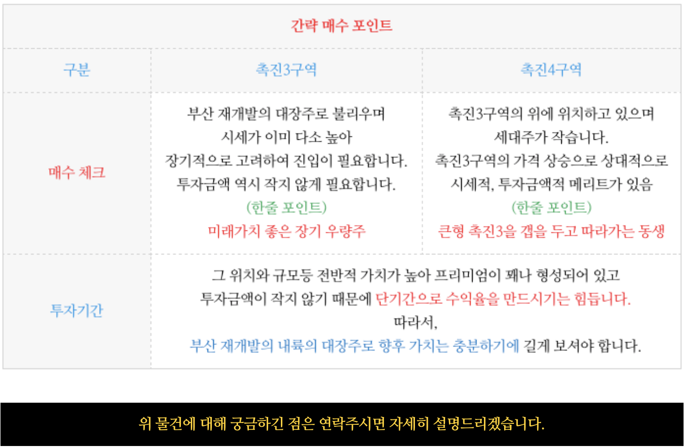 촉진4구역 과 촉진3구역 재개발의 매수시 체크 포인트를 간략히 정리해 드리겠습니다.