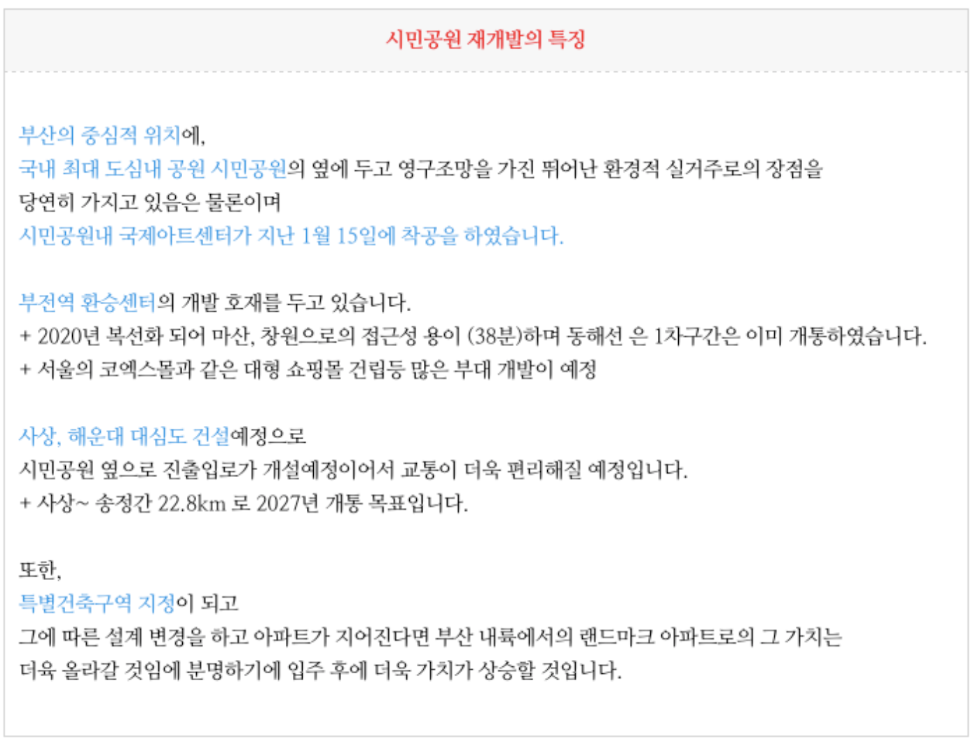 부산 중심도심에 위치하고 시민공원 남서향 방향으로 보는 재개발 구역으로 전세대 시민공원뷰 배치를 한다고 하며
