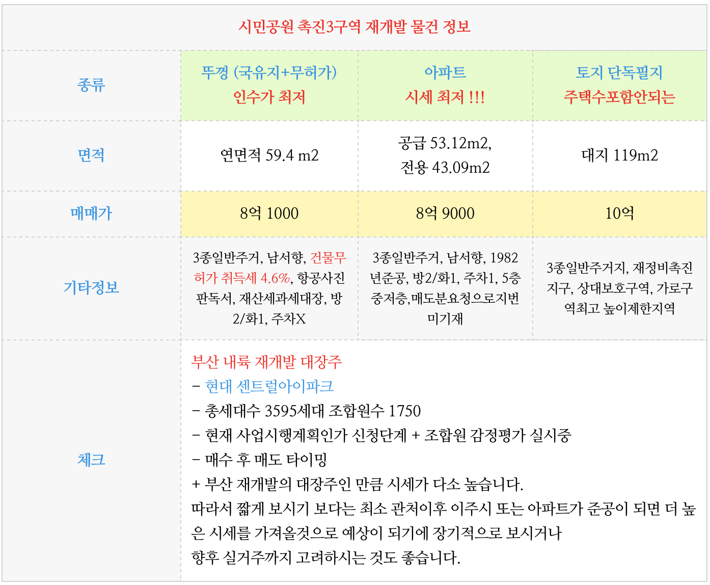 시민공원 재개발 구역들의 통일적인 특징 을 간략히 정리해 드립니다.