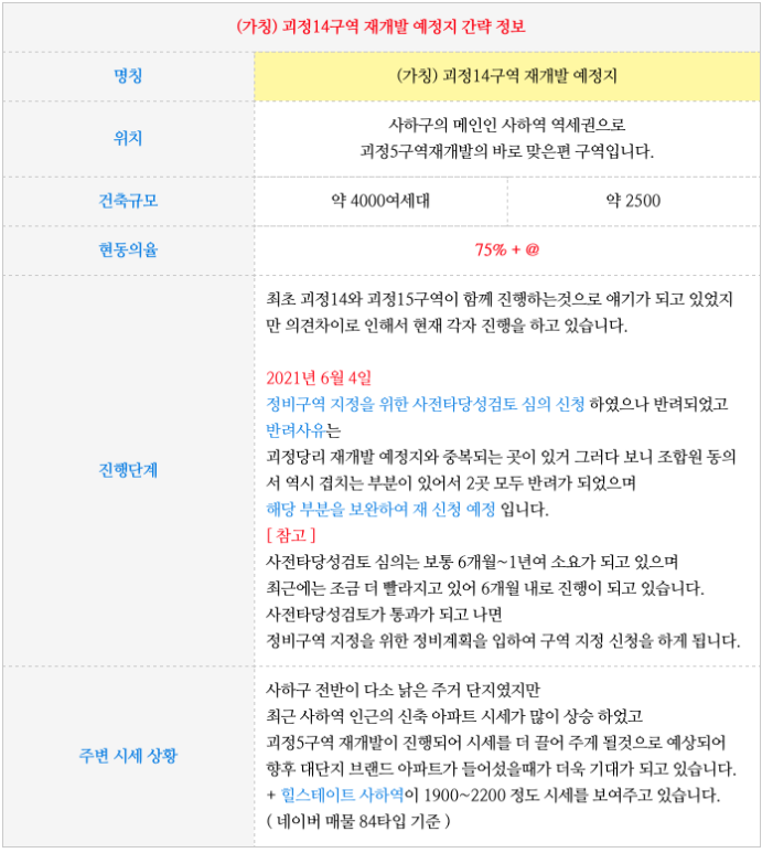 사하구 괴정14구역 재개발 예정지의 입지특징등 추가 사항은 아래 펭지를 확인 부탁드립니다.