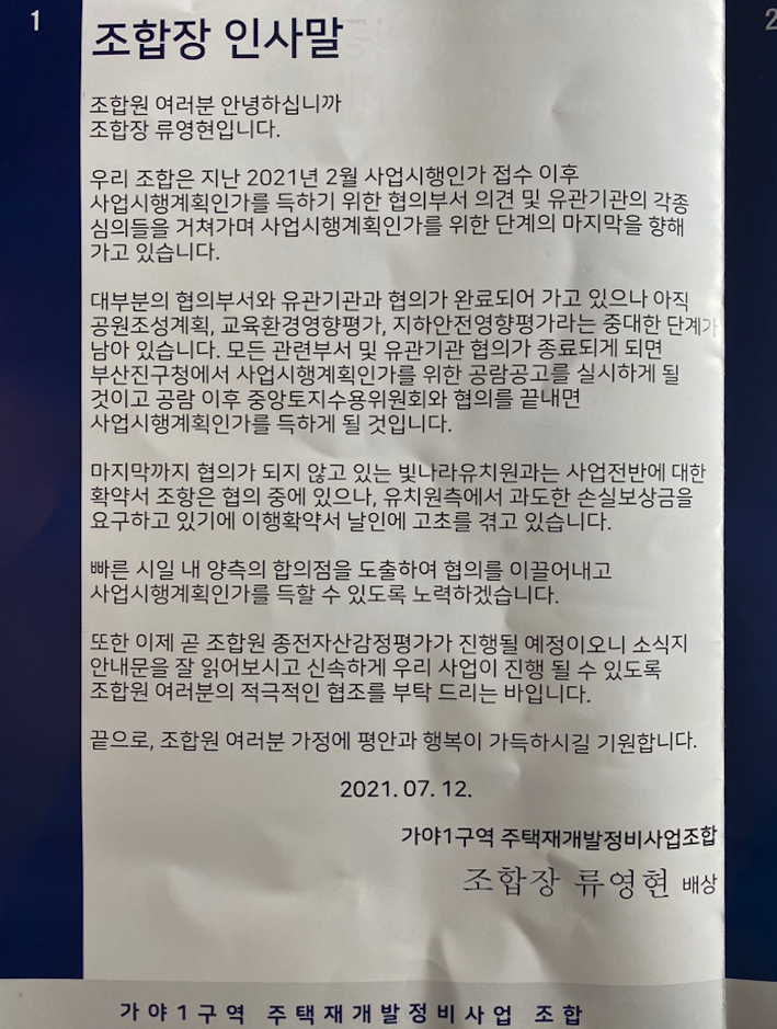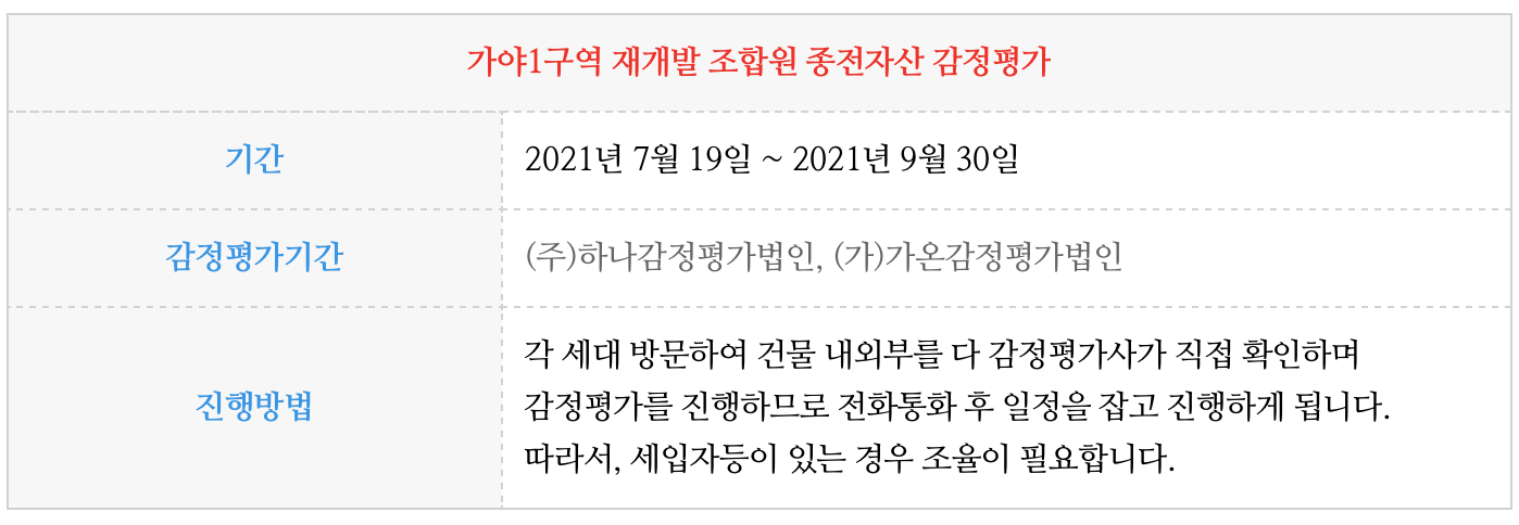 가야1구역의 조합원 감정평가 실시 소식 입니다.