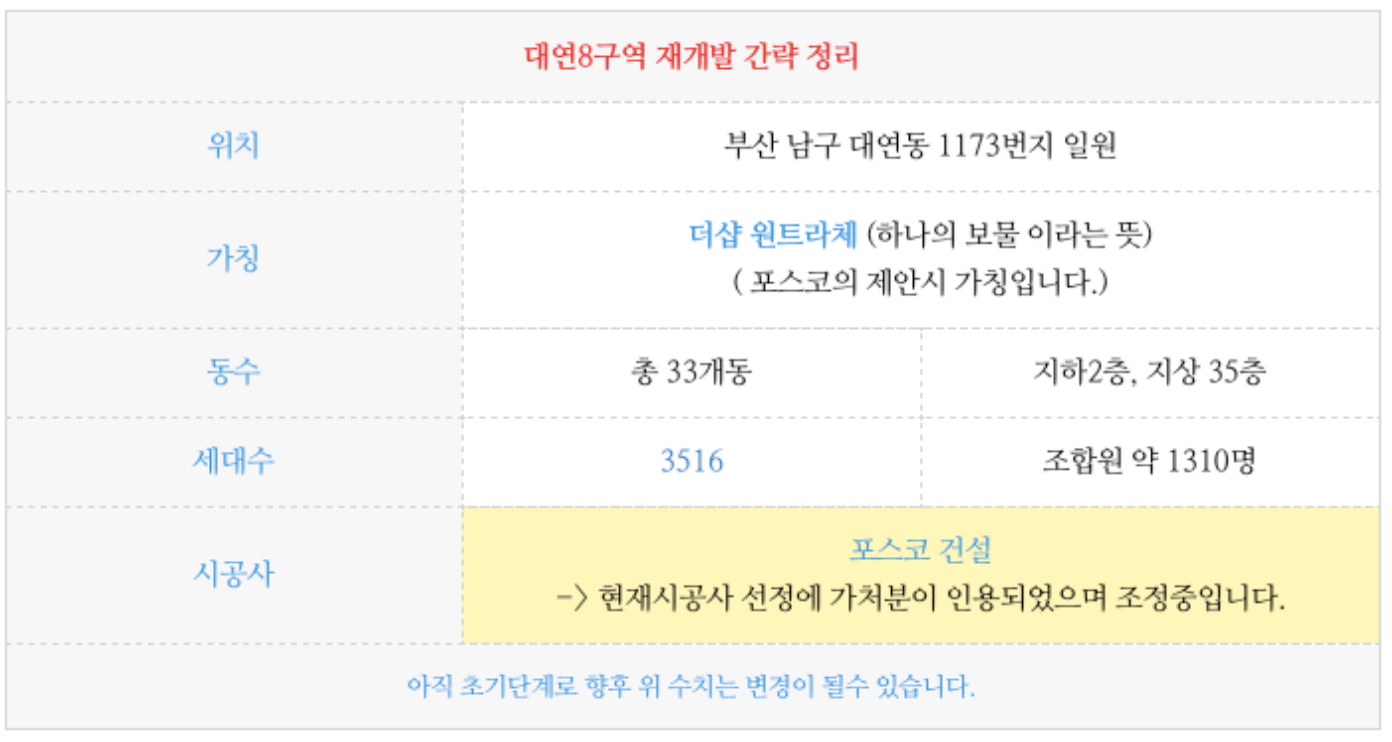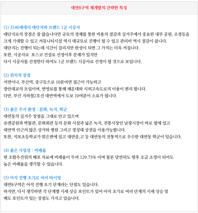 대연8구역 재개발의 간략한 특징들입니다.