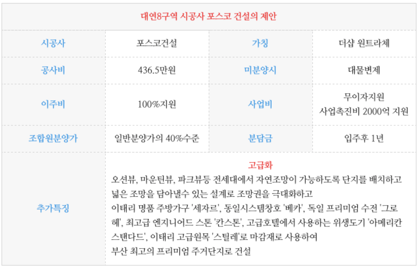 대연8구역 재개발의 현 시공사로 선정되어 있는 포스코 건설의 제안 내용을 간략히 정리하였습니다.
