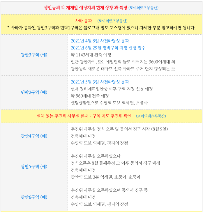 수영구 광안동의 각 재개발 예정지의 현재 진행상태를 정리해 드리겠습니다.