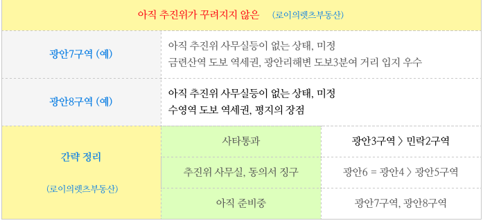 광안동의 각 재개발 예정지의 선진입시 장단점등 추가 사항은 아래 페이지에서 확인하시면 됩니다.