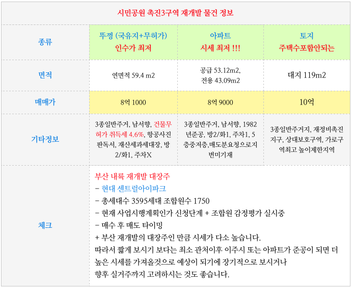 부산 시민공원 재개발에서 인수가 낮고 상대적 프리미엄 착한