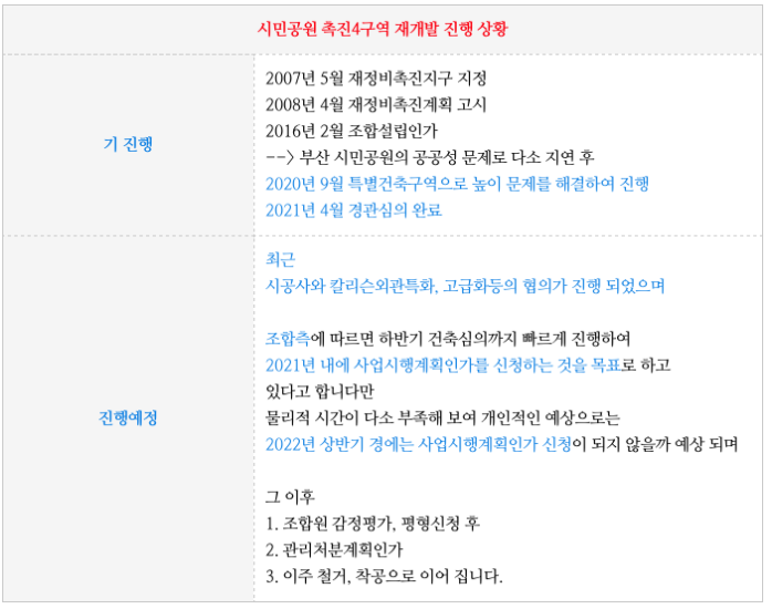 부산 시민공원 촉진4구역 재개발의 진행 상황입니다.