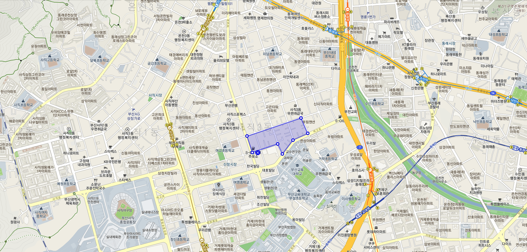 다만, 부산 지하철3호선 사직역, 1호선 교대역의 딱 중간쯤에 위치하여 도보 10여분정도가 소요가 됩니다.