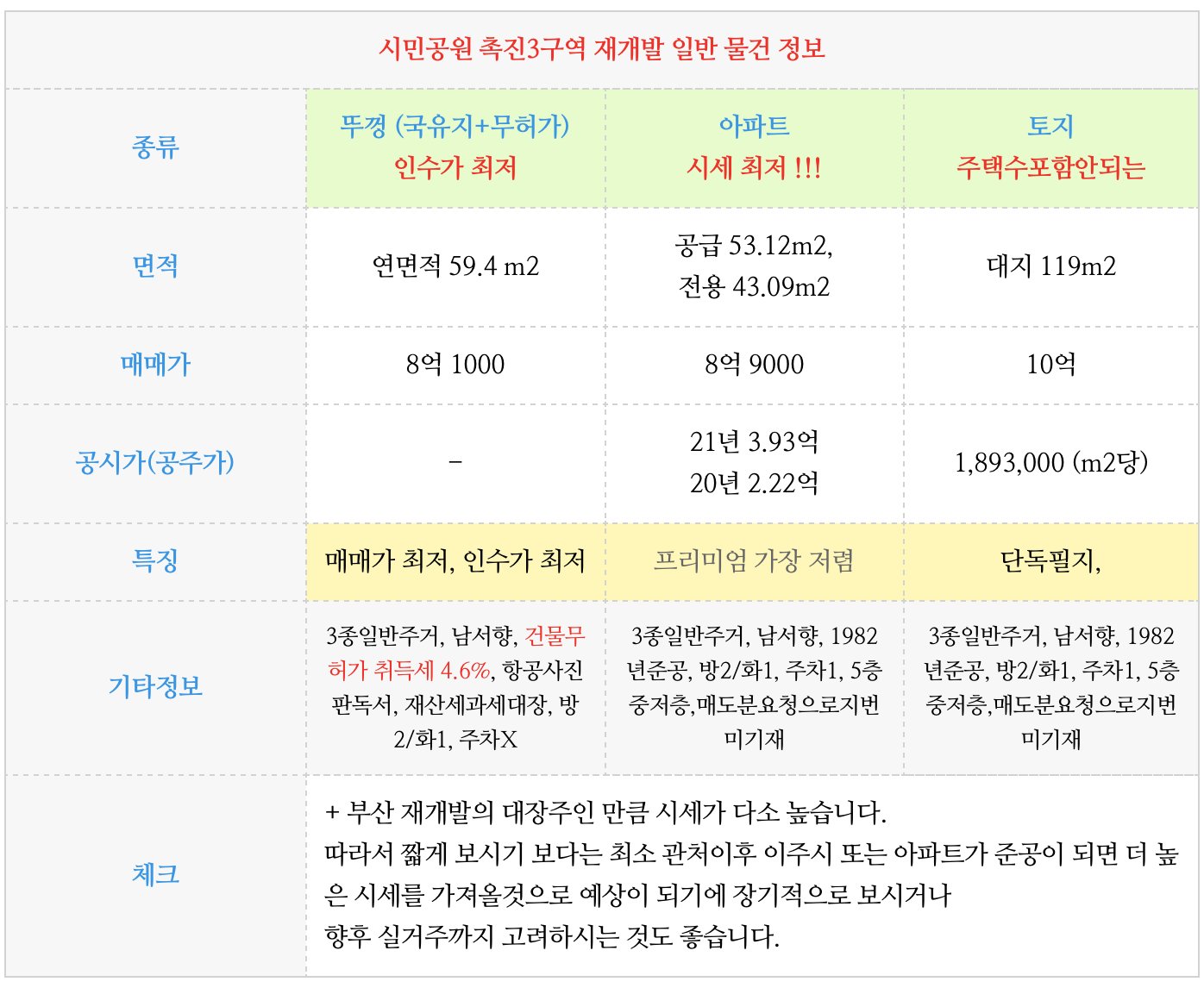 - 시민공원 재개발중에 현재 인수가가 상대적으로 낮아 가성비가 가장 좋은 곳이라고 할수 있습니다.