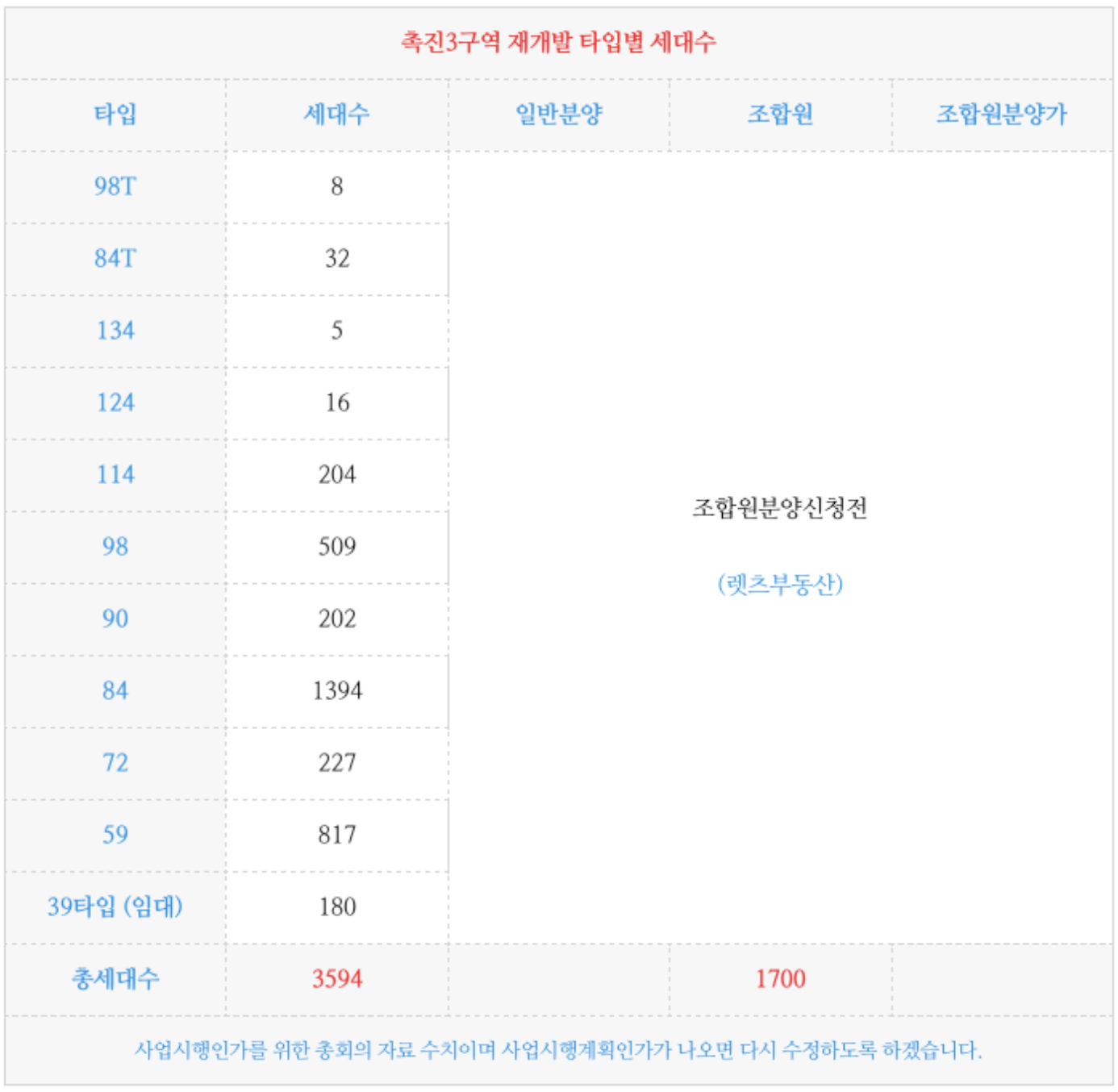 시민공원 촉진3구역 재개발 의 각 타입별 세대수 입니다.