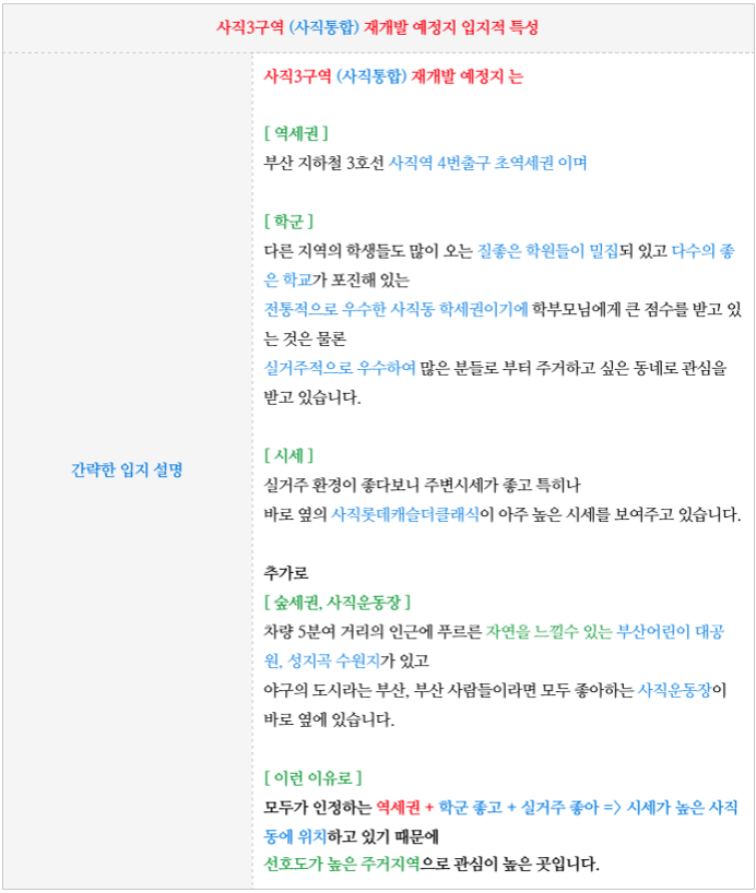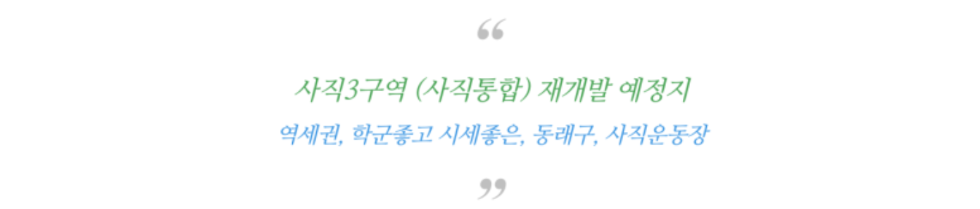 - 역세권, 좋은 학군, 좋은 시세, 숲세권, 사직운동장 : 실거주 선호도가 높은 곳