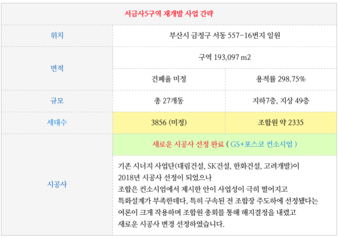 - 총세대수 2808세대로 서금사5구역과 동일하게 새로운 시공사 선정을 위해 조합원 총회를 진행하였고