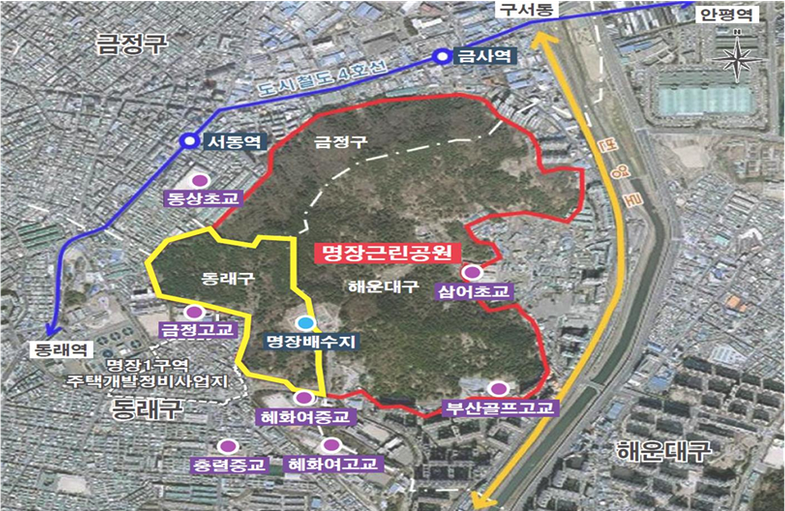 명장동의 한신, 동양, 아림파크등 저층 아파트들과 함께 접해있는 주변의 인근 주택가를 포함하여
