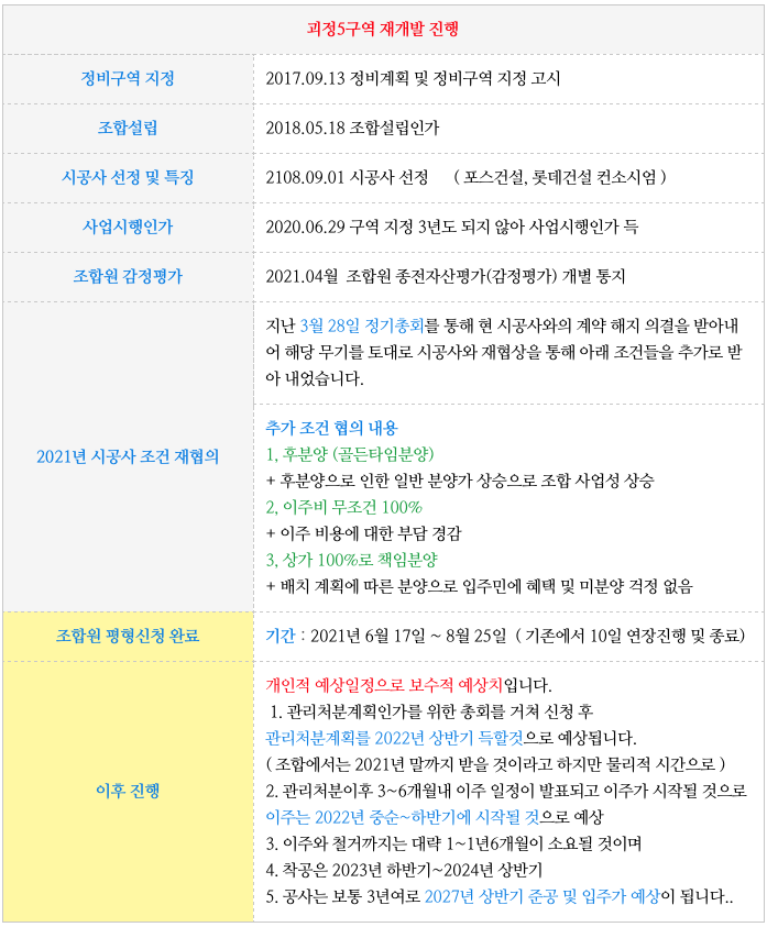 최근 감정평가가 개별 통지 되었으며 이제 조합원 분양 신청을 앞두고 있습니다.
