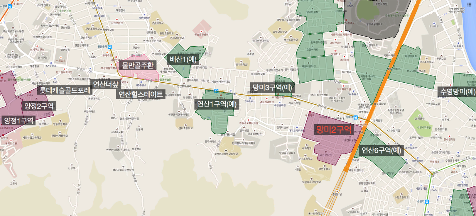 양정1구역, 양정2구역, 연산롯대케슬골드포레, 연산드샵, 힐스테이트 연산, 망미2구역등으로