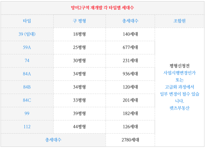 망미2구역 재개발의 현재의 각 타입별 세대수 입니다.