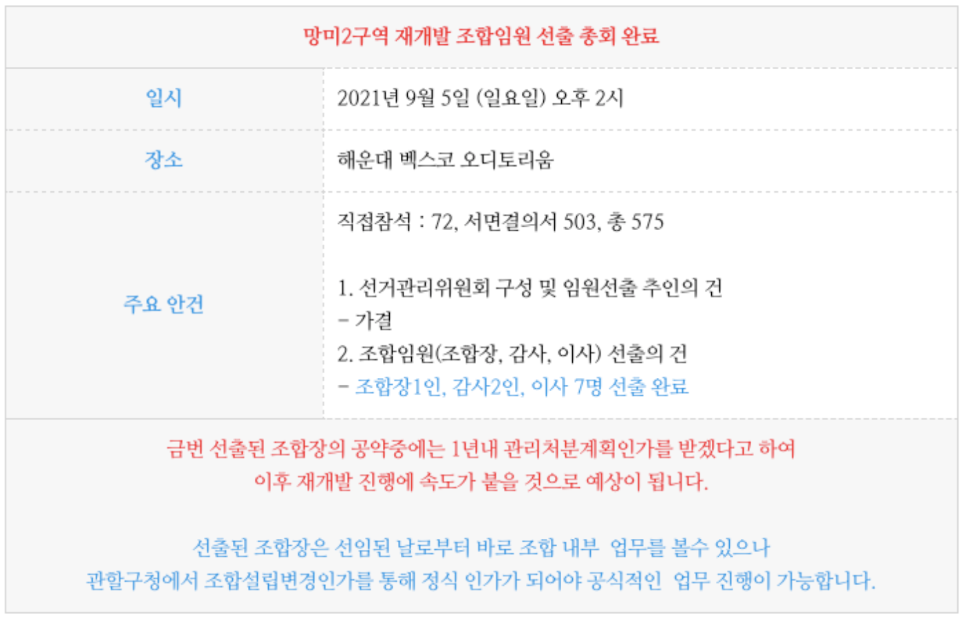 새로운 조합장과 임원분들을 중심으로 재개발 진행이 탄력을 받아 진행될 것으로 보입니다.