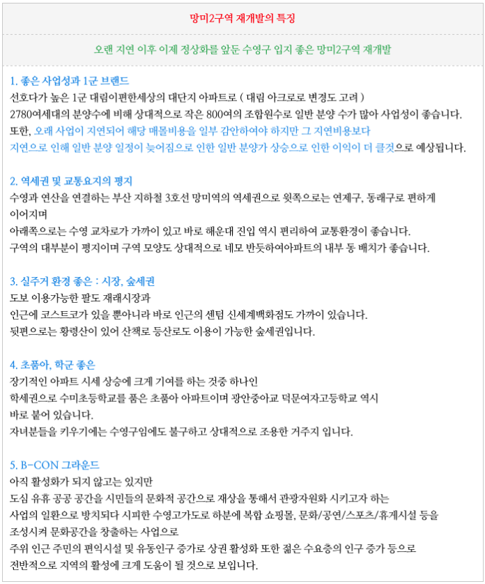 망미2구역 재개발의 특징과 장점을 간략하게 다시 정리해 드립니다.
