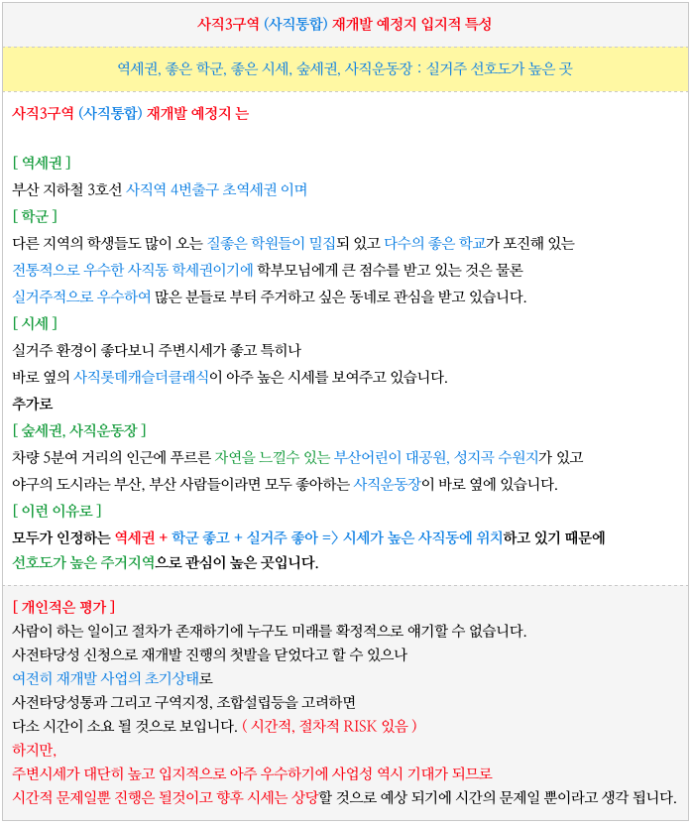 - 사작3구역 은 주변 시세가 워낙 좋아 많은 분들이 기대를 하고 있는 곳으로 짧게 보시기 보다는 조금더 길게 보시는 것이 더 좋아 보입니다.