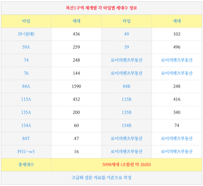 복산1구역 재개발은 각 타입별 세대수입니다.