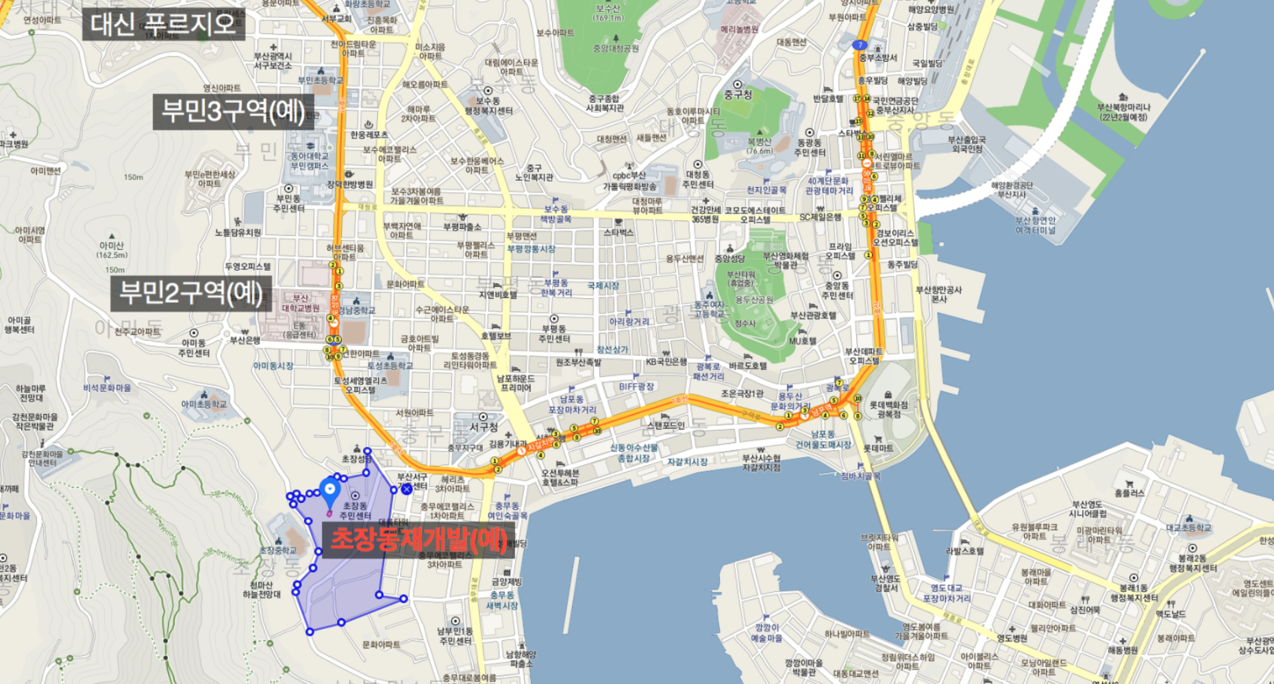 대신동 푸르지오1,2차아파트와 그 아래로 부민3구역, 부민2구역이 있고 그 하단으로 초장동 재개발이 위치해 있어