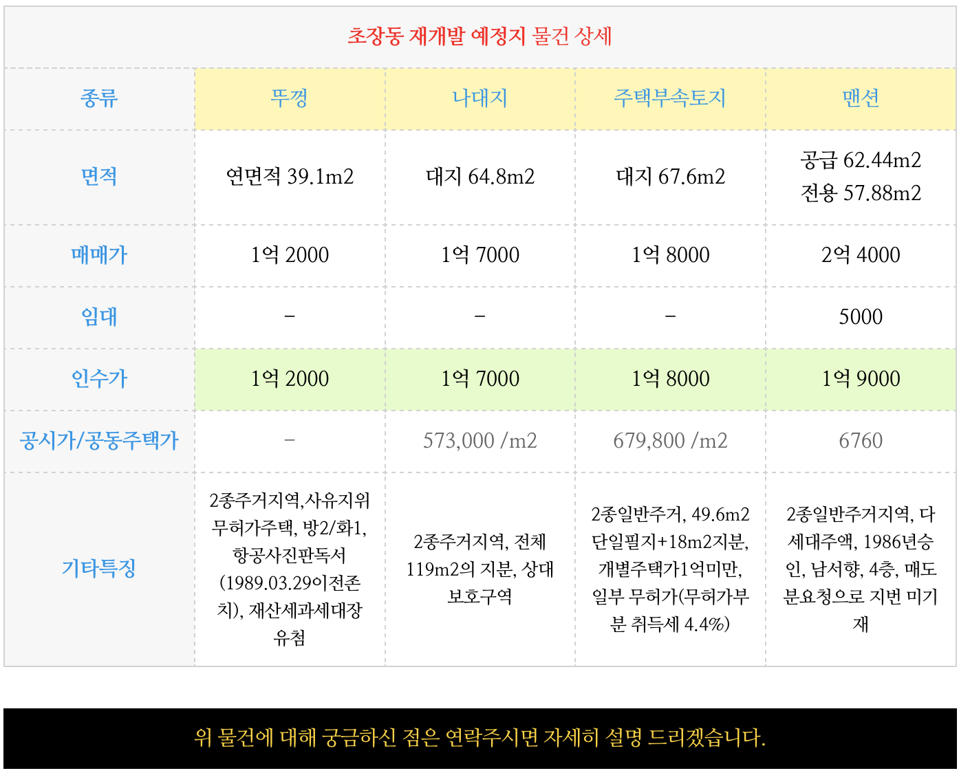 초장동 재개발에 대해 궁금하신점은 연락주시면 자세히 설명 드리겠습니다.