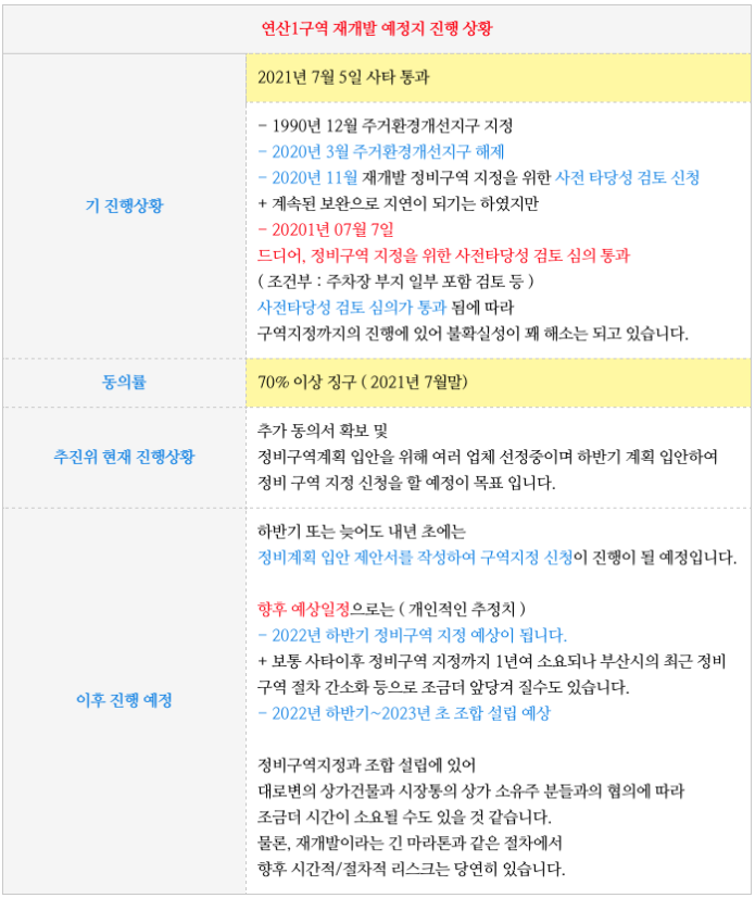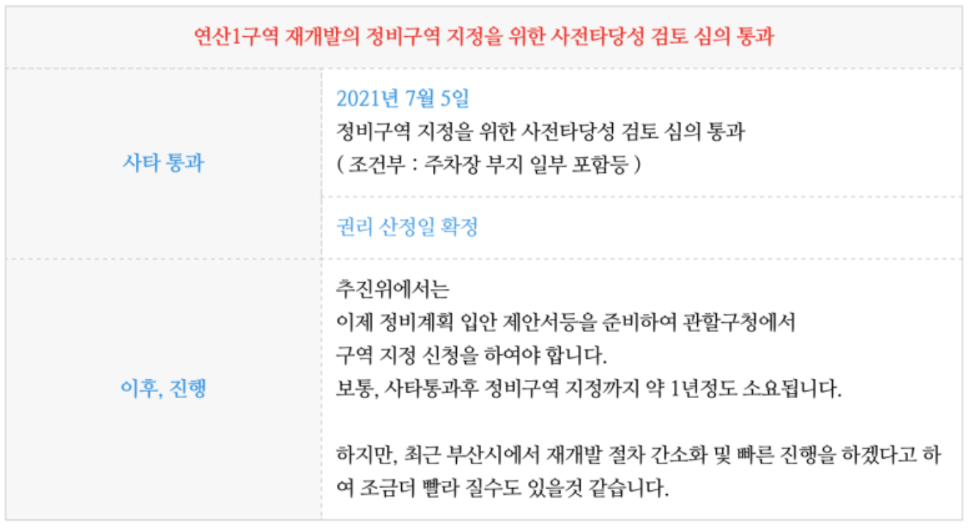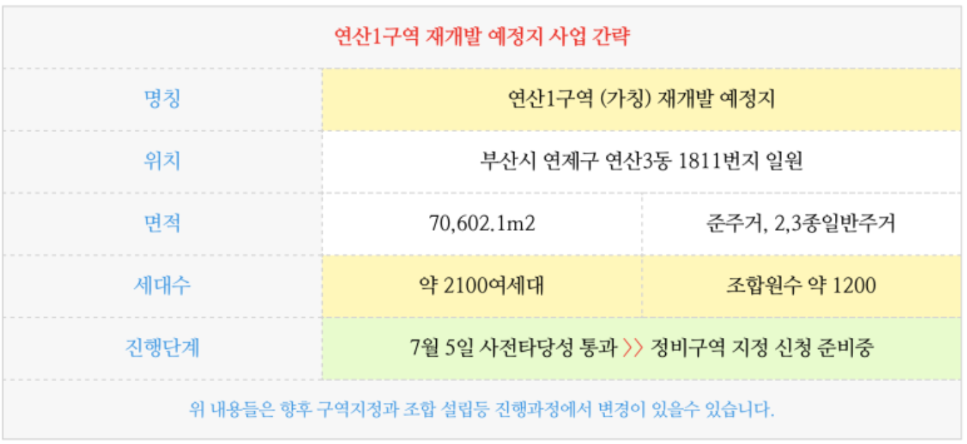 이에 부산의 많은 다른 주환지구들이 연산1구역의 진행절차, 단계. 시간등에 큰 관심을 가지고 있습니다.