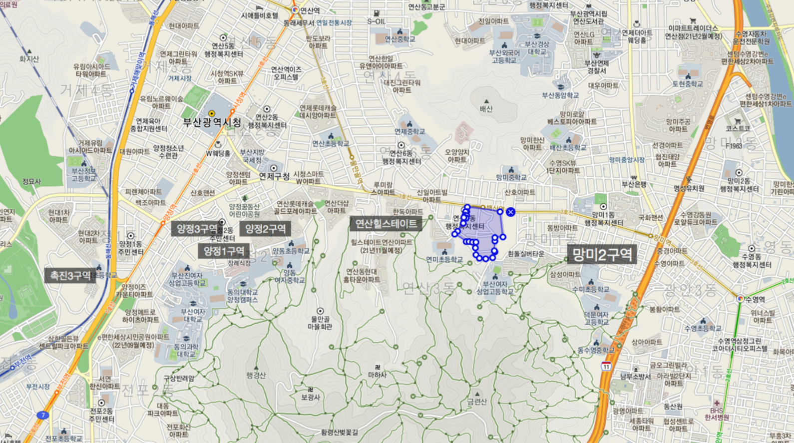 양정1구역, 양정2구역, 연산롯대케슬골드포레, 연산드샵, 힐스테이트 연산, 망미2구역등으로