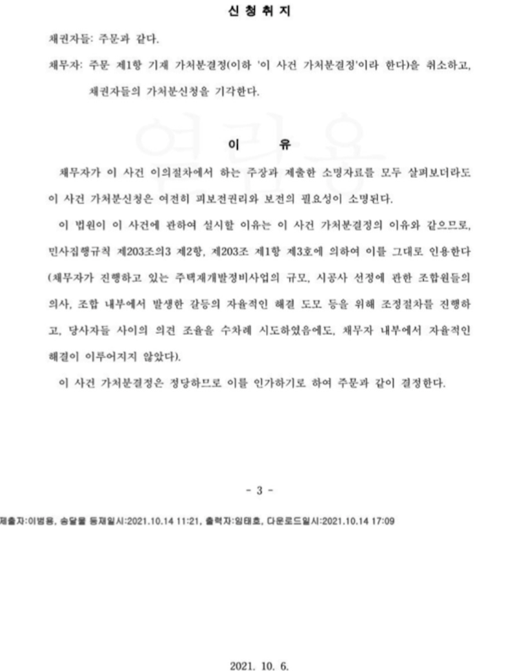 조합측의 가처분인용 이의 신청에 대해 법원에서 기각을 함으로써