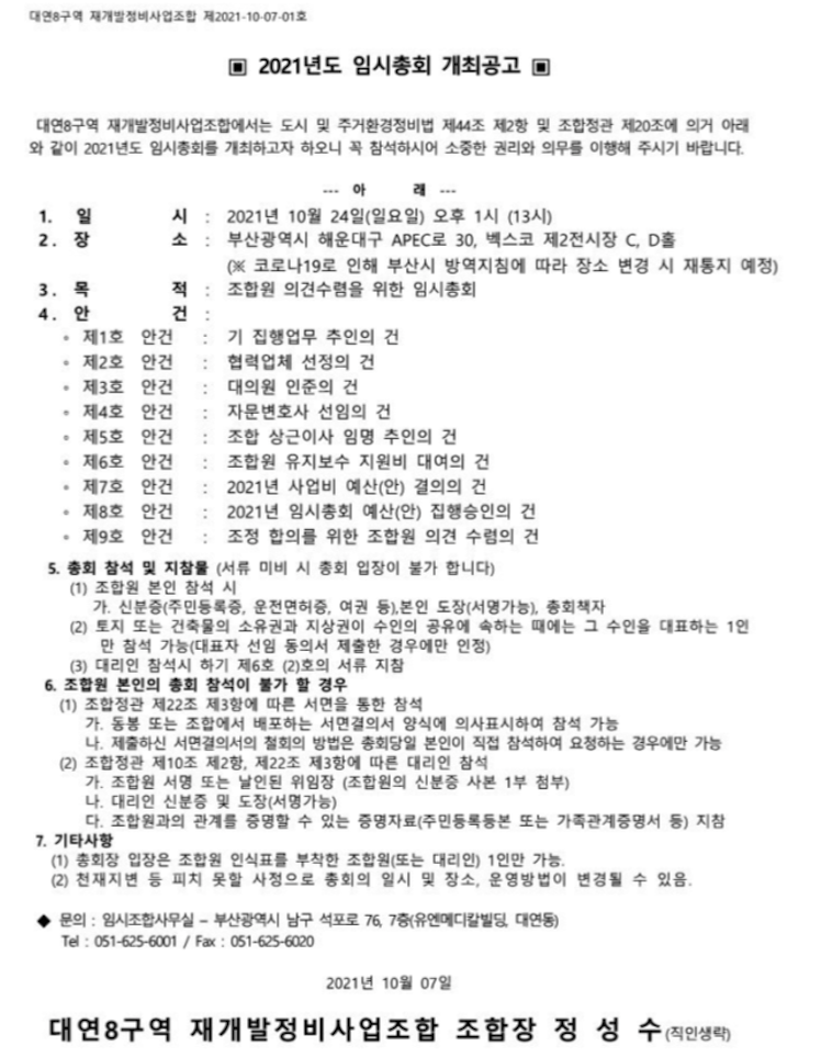 금번 10월 24일 임시총회를 통해 조합원분들에게 의견을 묻는 안건이 상정되어 있습니다.