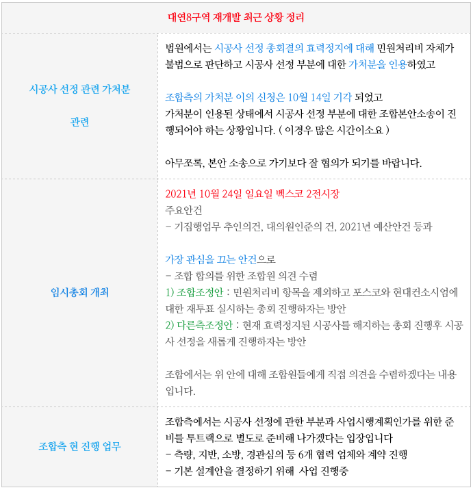 시공사 지위는 효력이 계속 정지 되어 있고 지난번 포스팅에서 말씀드린 각 조정안에 대해