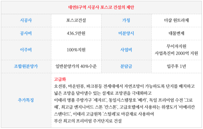 현 시공사로 선정되어 있는 포스코 건설의 제안 내용을 간략히 정리하였습니다.