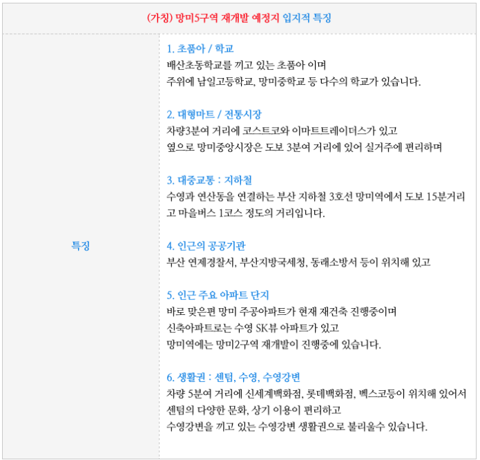 수영구 망미5구역 재개발 예정지의 입지적 특성을 간략히 정리하였습니다.