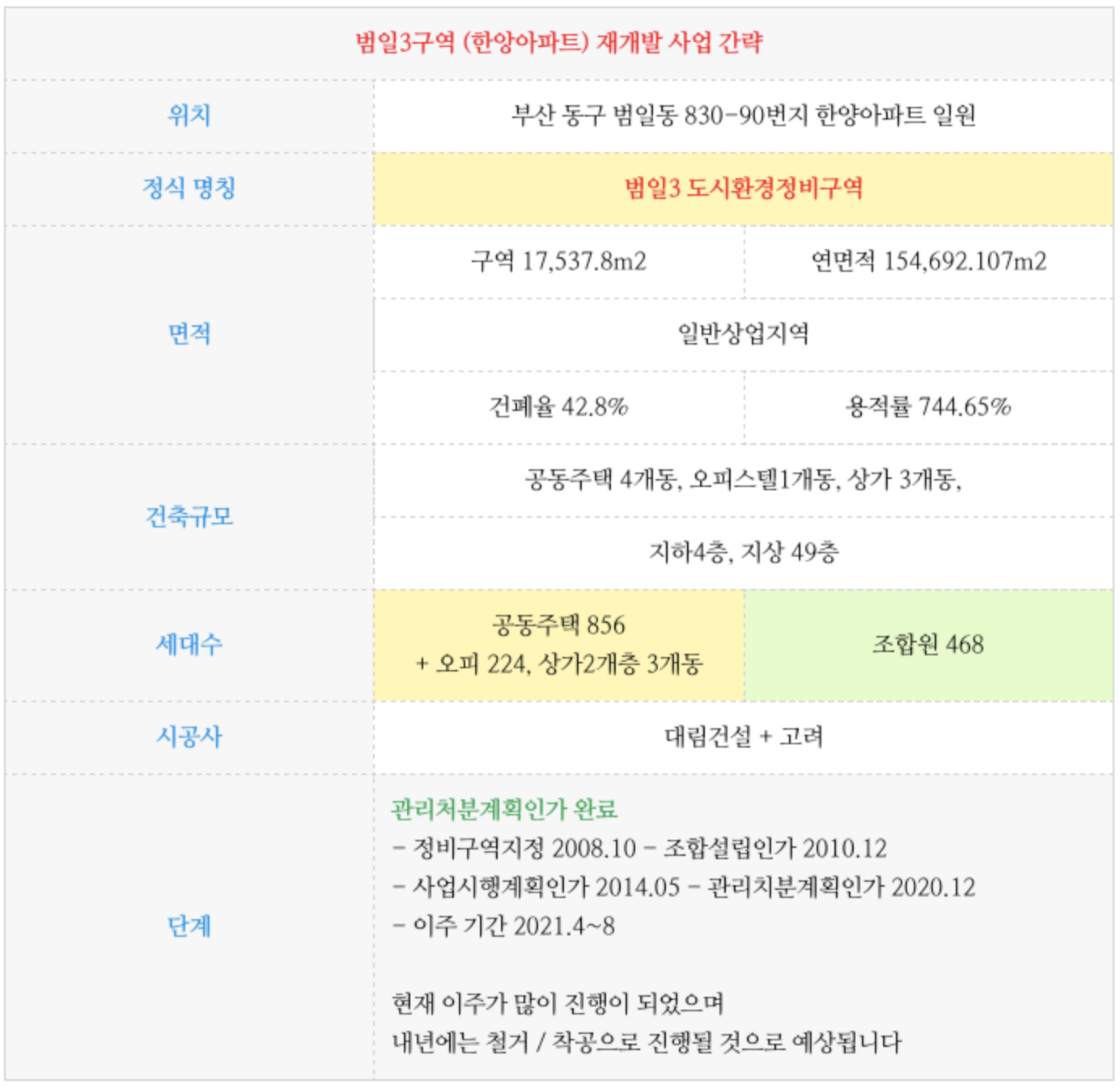 범일3구역 재개발의 간략한 특징 을 정리하였습니다.