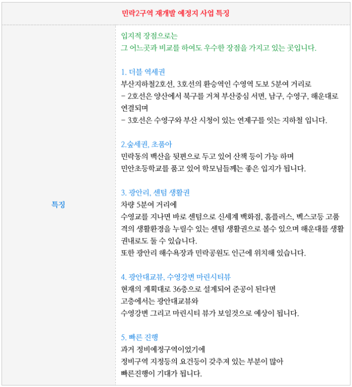민락2구역 재개발 예정지의 특징을 간략히 정리하였습니다.