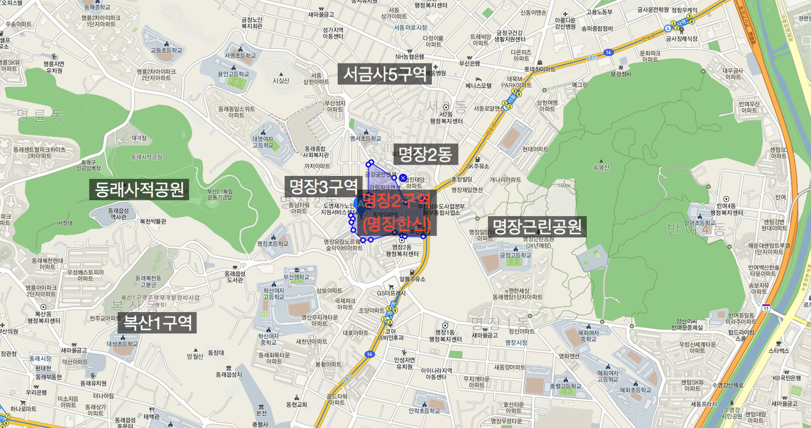 명장동의 한신, 동양, 아림파크등 저층 아파트들과 함께 접해있는 주변의 인근 주택가를 포함하여
