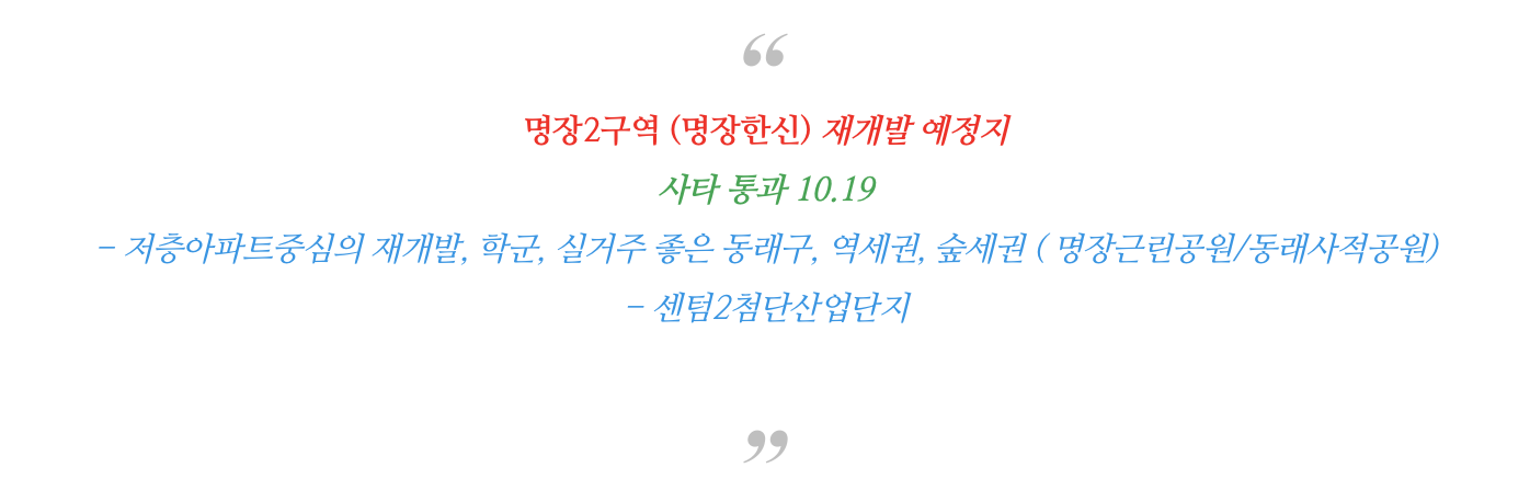 가장 중요한 학군과 실거주 좋은 동래구라는 장점과 센텀2산업단지라는 좋은 호재를 가지고 있습니다.