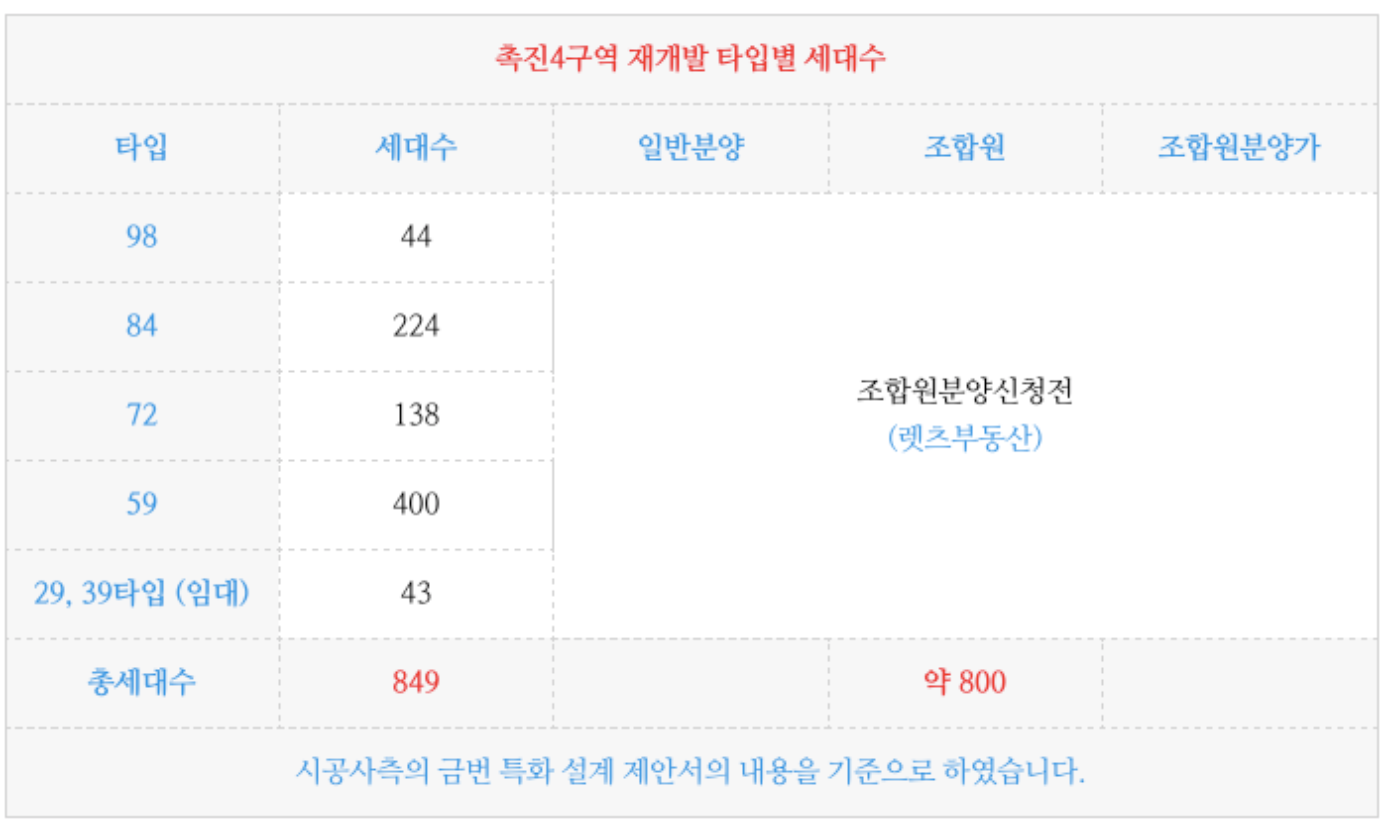시민공원 촉진4구역 재개발의 각 타입별 세대수 입니다.