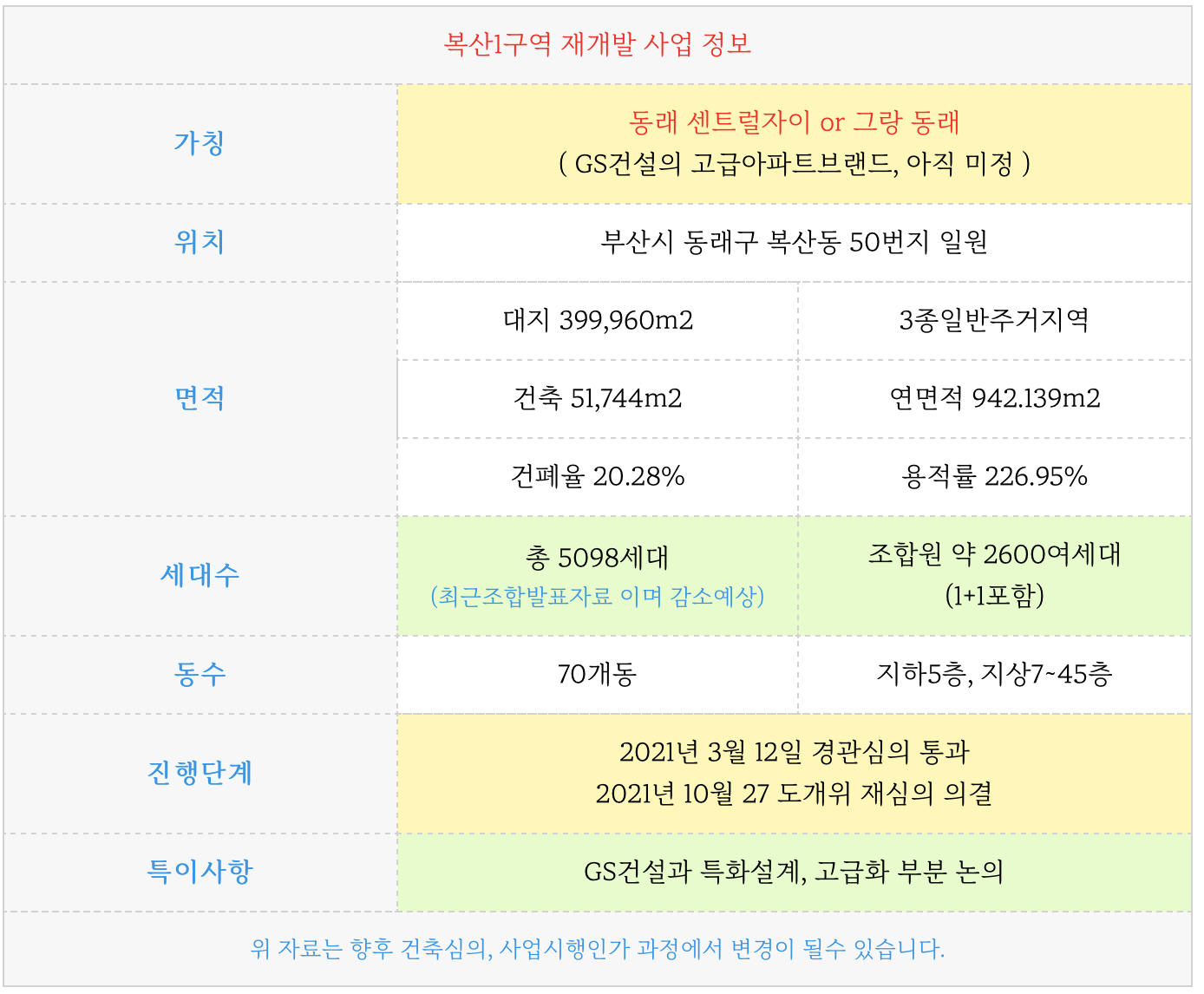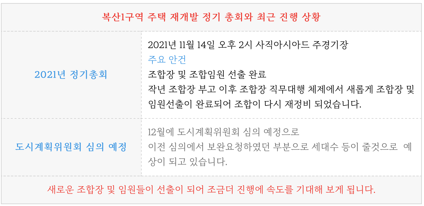 복산1구역 재개발의 진행상황 및 타입별 세대수 등은 아래 페이지를 참고 부탁드립니다.