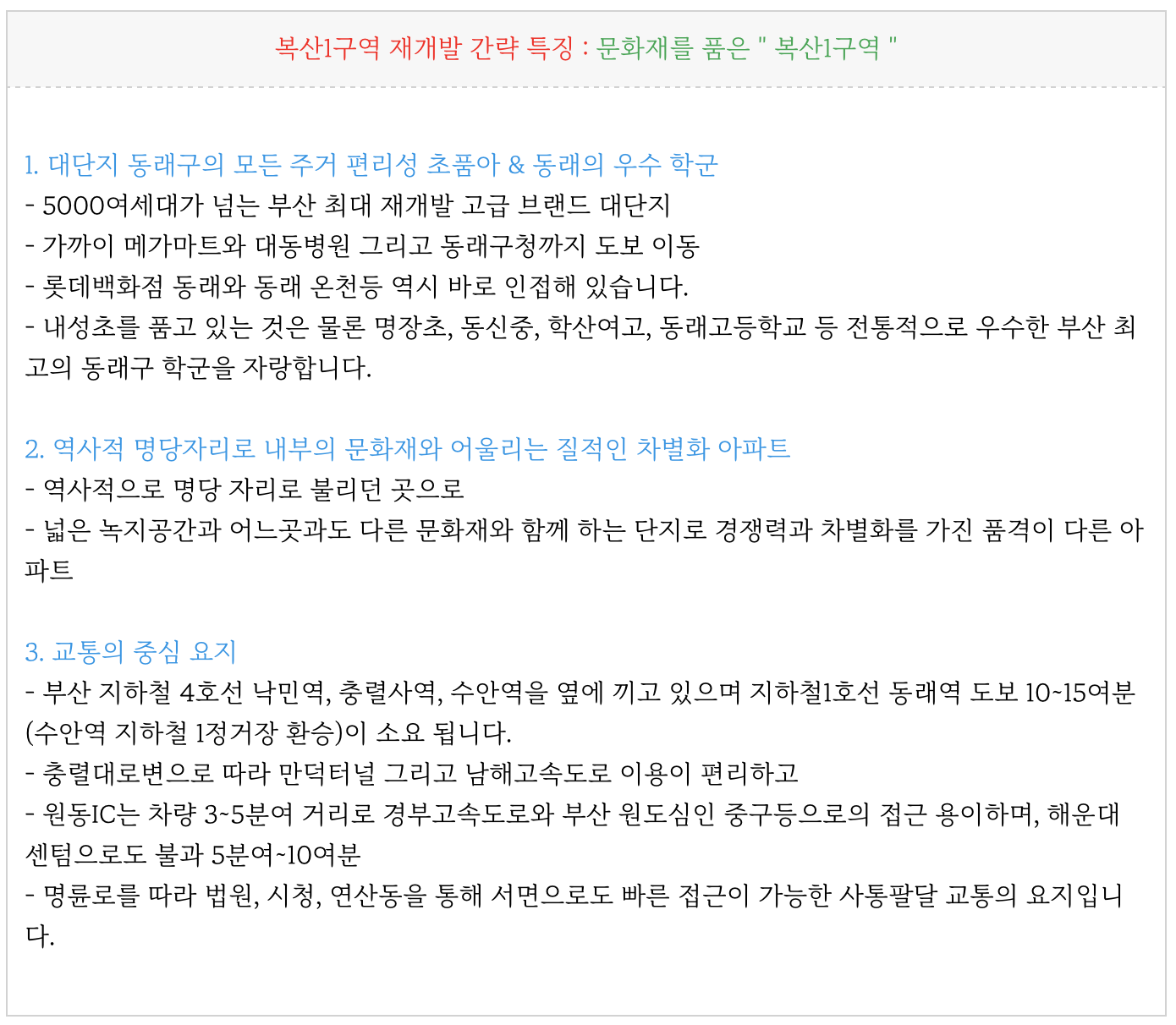 - 복산1구역 재개발은 그 입지와 규모에 비해 다른 구역들과 비교하여 문화재등이유로