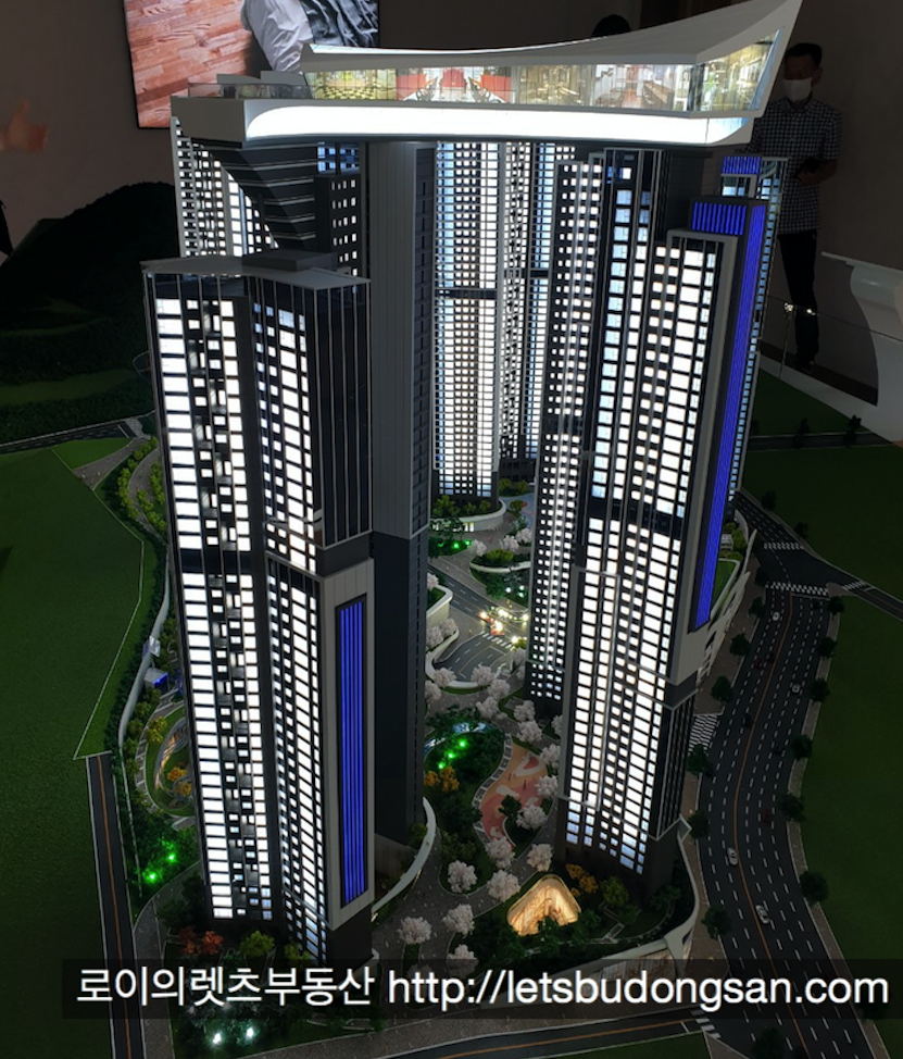 3개동을 연결하는 스카이브릿지와 외벽은 LED조명으로 큰 스크린이 되는미디어사파트가 적용되어